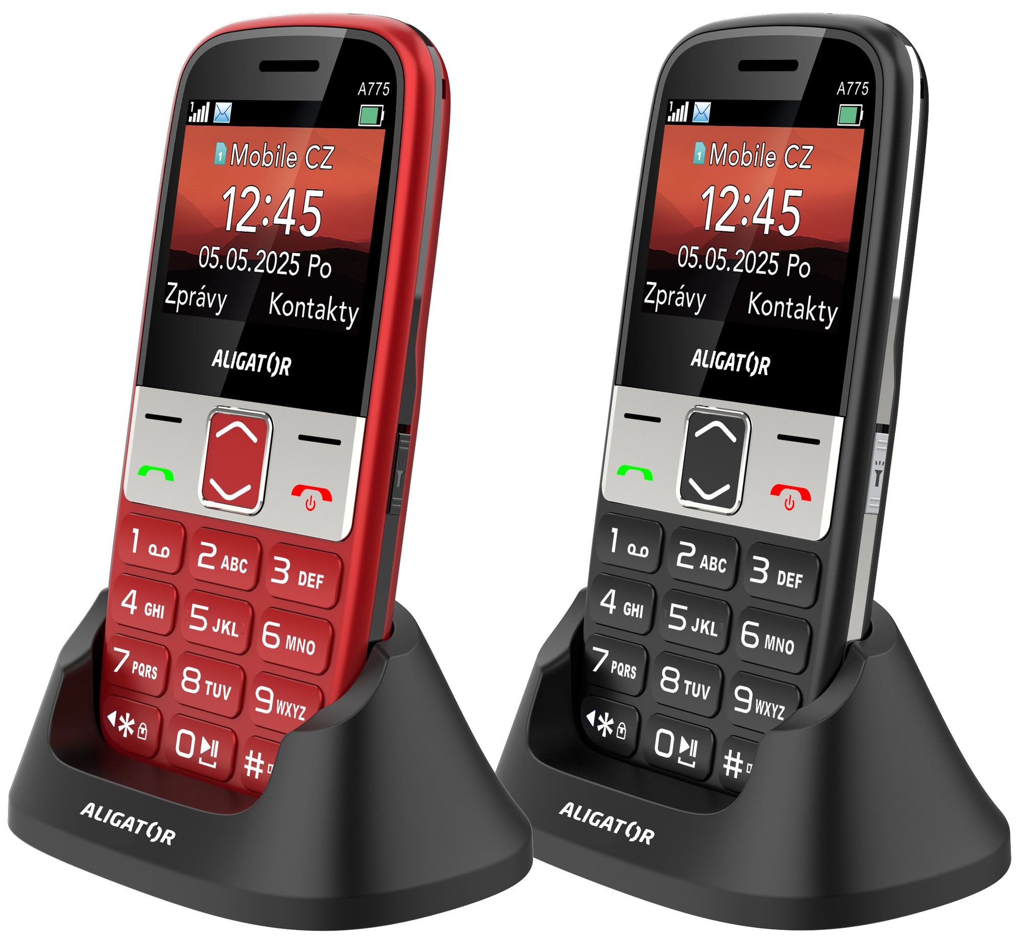 A775 Senior je dostupný ve dvou elegantních kombinacích – sametově černé se stříbrným rámečkem nebo červené metalíze s černým rámem. Obě verze doplňuje povrchová úprava v barvě kartáčovaného hliníku. Tento telefon je skvělou volbou pro každého, kdo hledá spolehlivý, přehledný a stylový telefon pro každodenní použití.